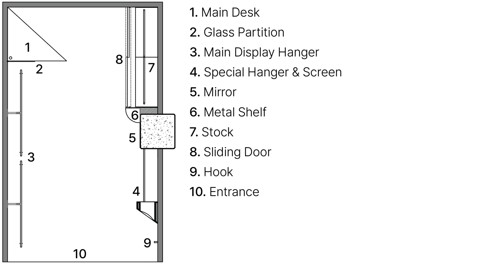 The overall tone is expressed based on vanilla ice to suit the brand name, reflecting a clean and bright shiny feeling, and the ceiling barisole lighting uniformly illuminates the space, allowing light to convey a luxurious and sturdy image using the connection of glass and metal steel furniture and structures, while providing a good contrast of texture. The textures of cold concrete columns, desks, and object stools are designed to blend smoothly, and they stand out for their unique design. |